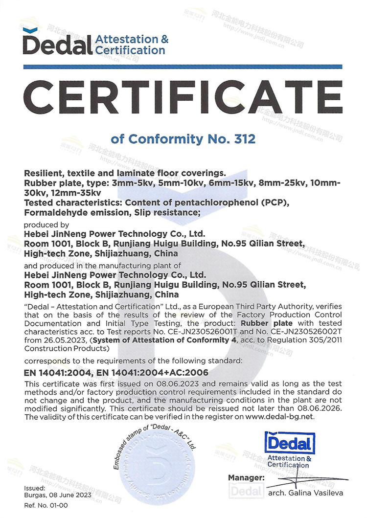 絕緣膠墊是電力安全不可或缺的一部分,其質(zhì)量和性能對于保護(hù)人員的安全至關(guān)重要。通過獲得CE認(rèn)證,并結(jié)合已于先前通過的國際電工協(xié)會(huì)IEC耐壓性能檢測報(bào)告,說明金能電力絕緣膠墊的產(chǎn)品質(zhì)量、安全性和環(huán)保等級(jí)的肯定已經(jīng)得到主管機(jī)構(gòu)的認(rèn)可,產(chǎn)品符合歐盟的相關(guān)標(biāo)準(zhǔn)和法規(guī)要求。