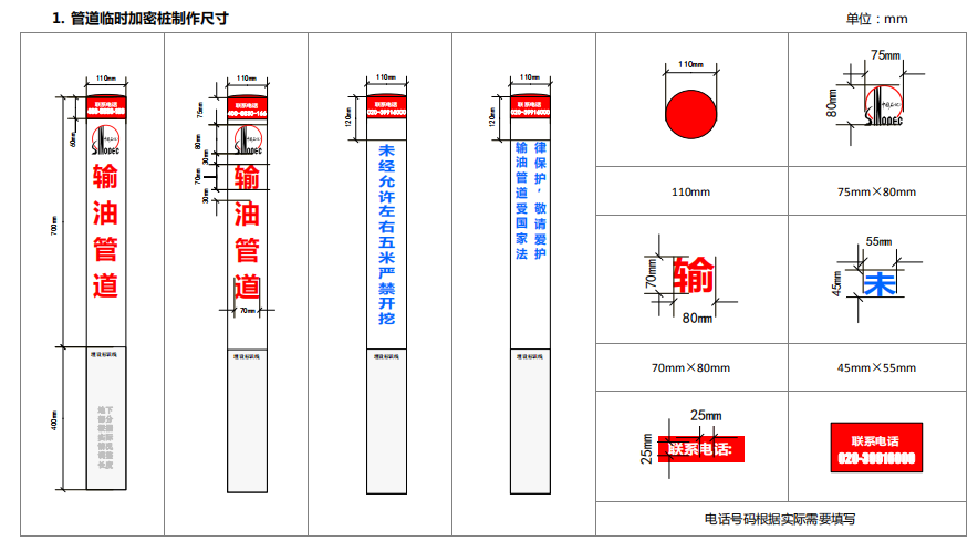 臨時加密樁材料: ø110mm×3mm×1100mm PVC 管制作,標識的內容用戶外漆絲印。